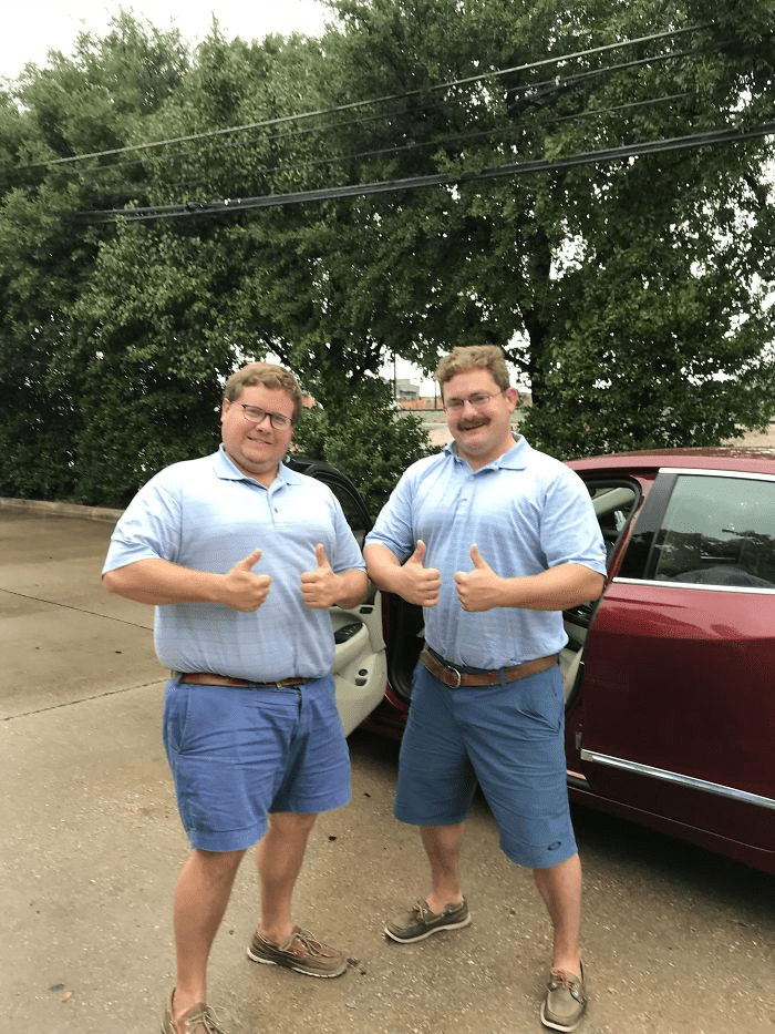 Even down to the details of the belt and shoes, these two men are wearing outfits that are literal copies of each other. The man with the mustache just needs a quick shave in order to make this picture truly perfect.