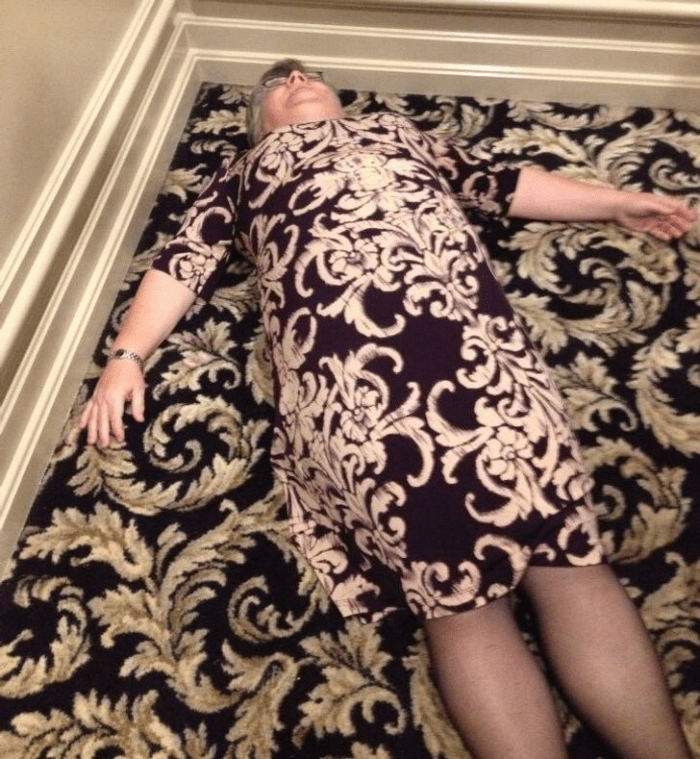 Because of this amazing coincidence, this older woman can conveniently camouflage into the carpet and hide, it’s almost as if she’s a chameleon.