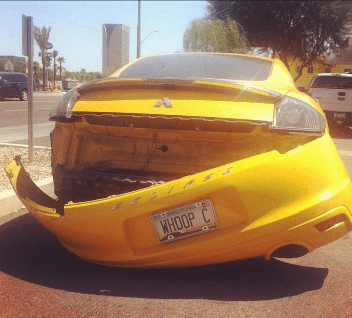 It looks like this Honda had a license plate that could read the future. It seems to have predicted its own demise in its back bumper falling off.