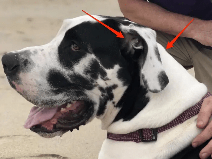 Now, this is a creepy looking coincidence that has us shivering in our seats. Somehow this adorable black and white pup has its own face reflected in the fur of his ear.
