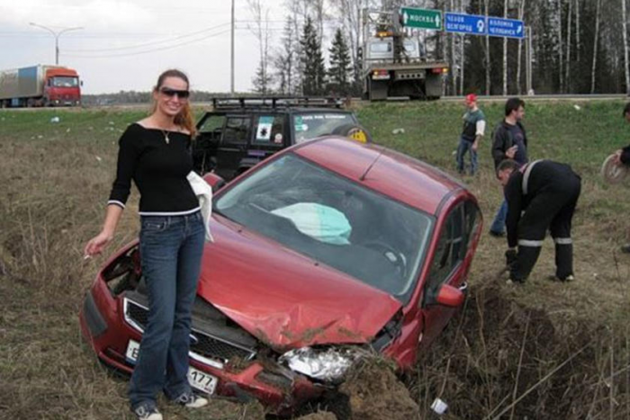 Few people would get into a car wreck and think that it would make an excellent moment to pose and take a photo. This woman seems to be an exception to that rule, though! She’s up and smiling and ready for the camera. Even though everyone in the background seems to be more concerned with how to get out of this mess.