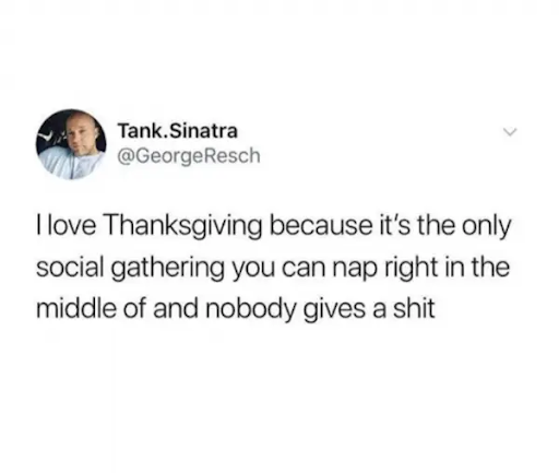 Family gatherings can get tiring. You might be tempted to leave early or head to your bedroom and catch some zzzs, but this is considered impolite. However, these rules can be broken when it comes to Thanksgiving. Putting yourself into a food coma and passing out on the couch is A-okay this Thursday night!