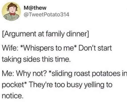 This is the only correct way to take “sides” during a family fight. In the heat of the moment, no one’s going to notice you sneaking away your mom’s famous potato salad. In fact, you might be able to sneak right out the front door if you really want to get out of there!