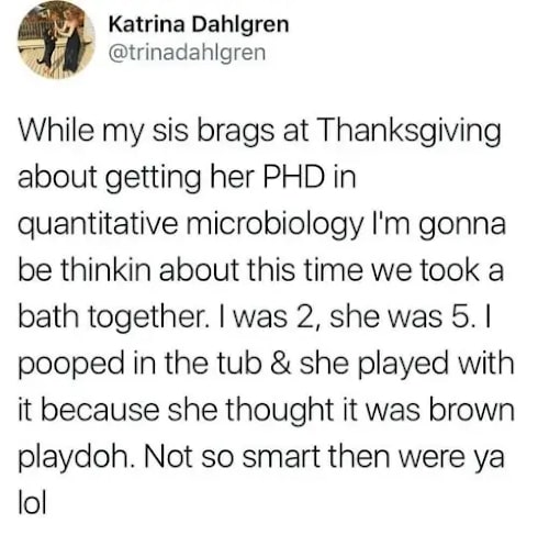 It’s times like that when you can remember, or possibly reveal, the times they acted like a total moron. Sure your sister has a PhD now, but she wasn’t always as smart as she thinks she is. The best way to cut off someone’s incessant bragging is by taking them down a notch. We say bring the poop story up!