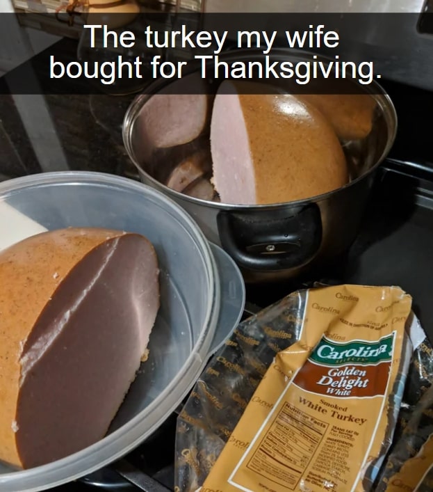 Did this man’s wife think deli turkey was the same as a whole turkey? Was she trying to cut down on cook and prep time? Cooking an entire turkey takes hours, maybe she wanted to save that time to work on the sides. Either way, this is going to be a very interesting Thanksgiving dinner.