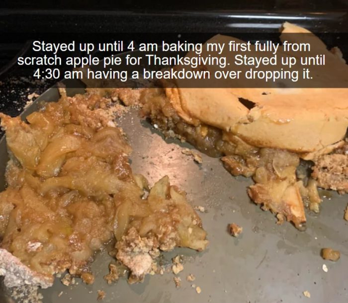 Experimenting is the last thing you want to do the night before Thanksgiving. With all the prep that goes into making the meal, it’s going to be a huge pain working on something you’re unfamiliar with. It looks like this person was a little too ambitious and ended up royally messing up. She didn’t overcook the pie or use any incorrect measurements though…