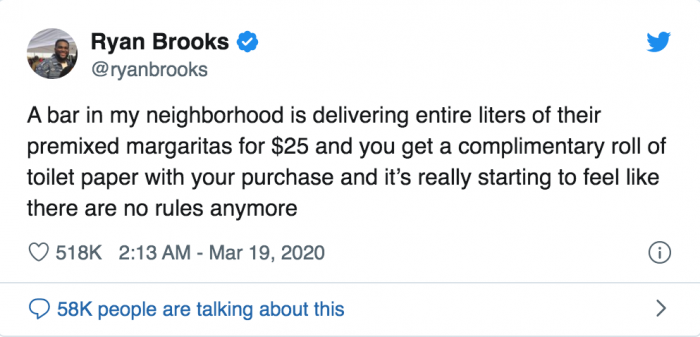 Anyway, this bar is using the offer of complimentary toilet rolls when you spend over 25$ on drinks, tell me that would have made sense 3 months ago.