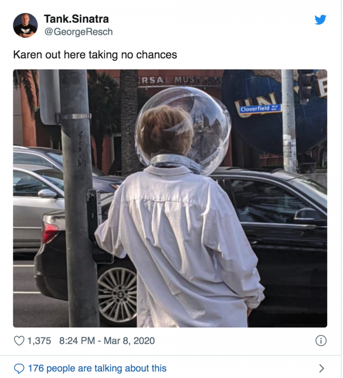 Some people are taking this global pandemic super seriously, and taking the CDC’s recommendations on social distancing and health precautions to another level. For example, our friend Karen here is not taking any chances and gives zero, you know whats, about what people think when they see her walking down the street.