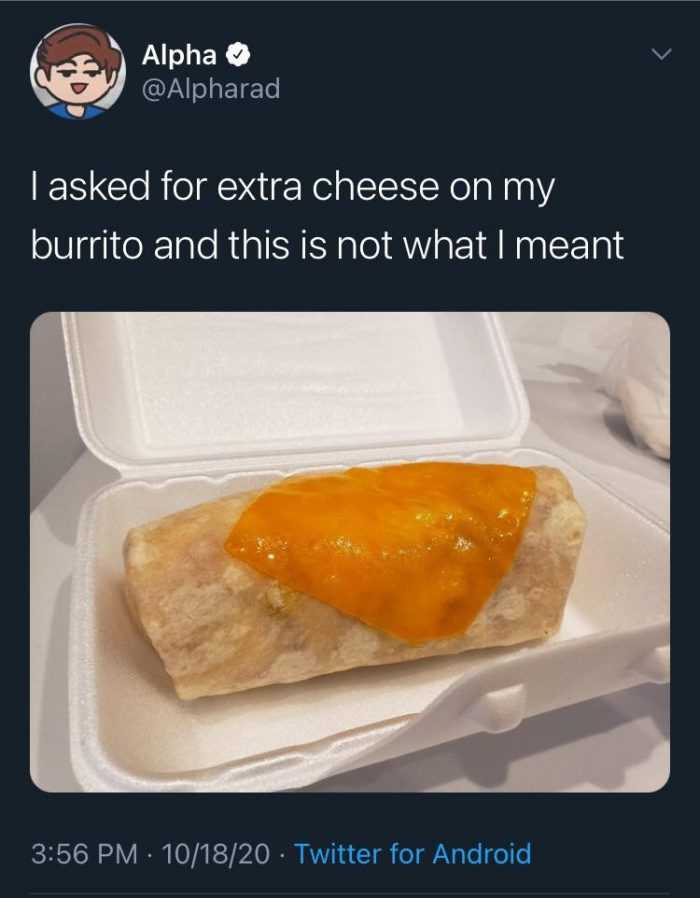 These people are paid to put together orders as quickly as possible, not stop to ponder the deeper meaning of what they’re instructed to do. It’s clear that these workers simply followed the instructions too literally, and straight up threw a slice of cheese on the burrito. Honestly, the results are hilarious.