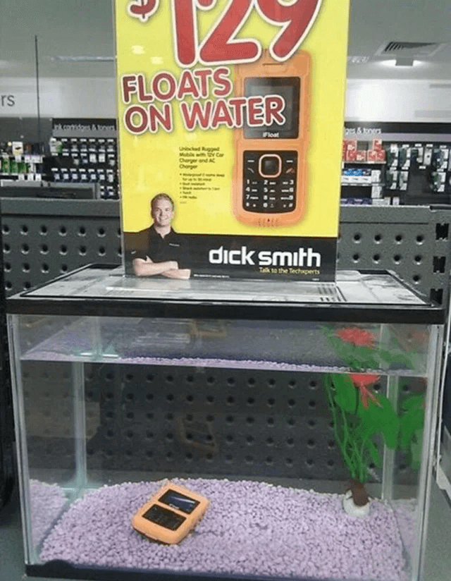 Now, it’s a bit hard to tell who exactly messed up their job in this scenario. Here we can see a sign for a phone that supposedly floats on water. But then in the tank below it, you see the very same phone, and it’s very clearly not floating at all. In fact, it’s sunk to the bottom (as most phones would). It’s unclear who exactly messed up in this situation.