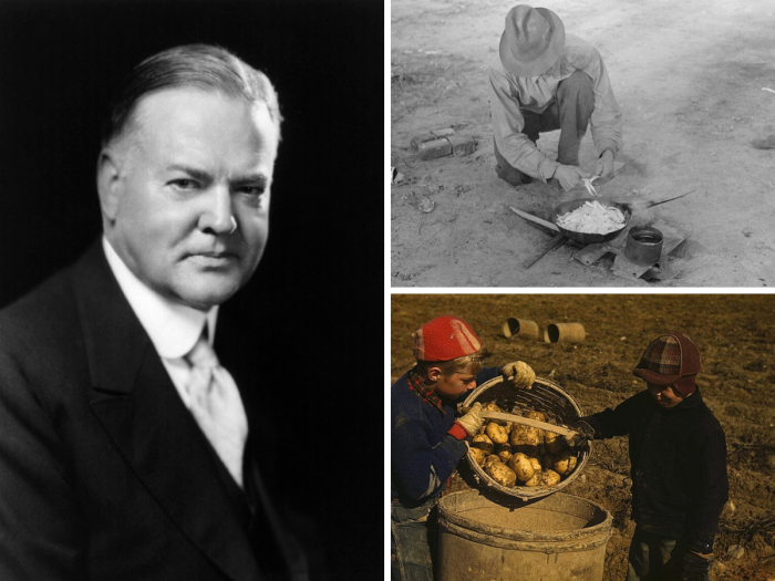 Shanty towns that sprang up as more and more people lost their homes, which were called ‘Hoovervilles’. Food in soup kitchens was often called ‘Hoover Stew’, and the newspapers that people used to keep themselves warm were ‘Hoover blankets’.