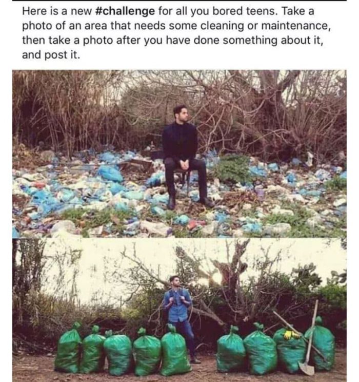 “Here is a new #challenge for all you bored teens. Take a photo of an area that needs some cleaning or maintenance, then take a photo after you have done something about it, and post it.”