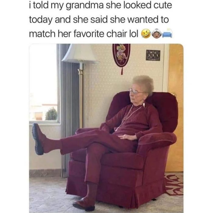 This incredible moment was taken by this woman’s grandson, he told her she looked cute so she wanted to match her outfit with her favorite chair in the house which came out so hilarious it had to be on our list.