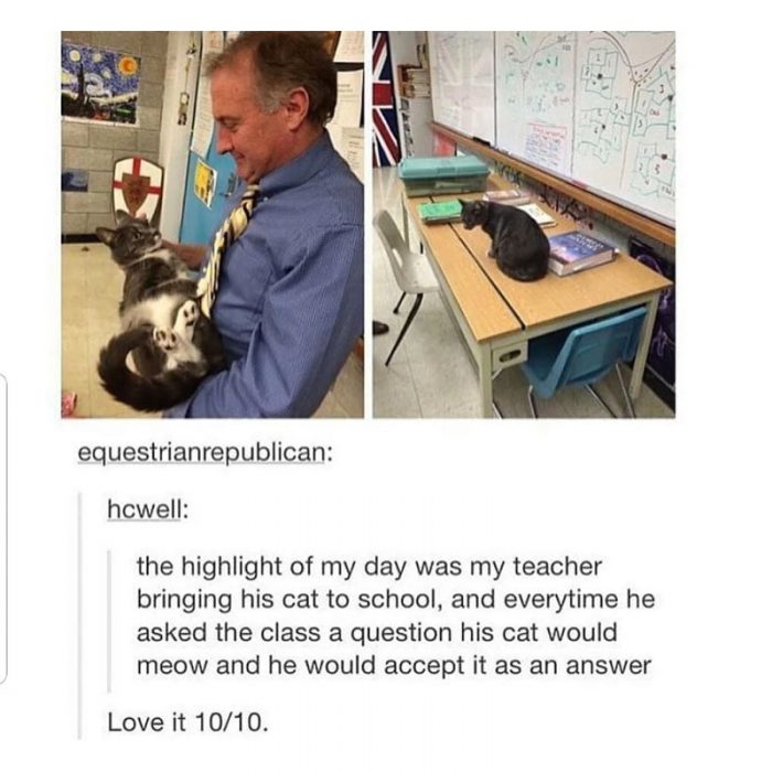 This teacher loves cats so much he decided to bring his own feline friend to school. Every time he asked the class a question the cat meowed and he would accept it as an answer.