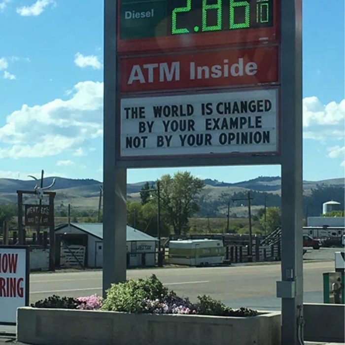 This was captured in a gas station, the sign says: The world is changed by your example, not by your opinion.” This is an important message letting people know opinions don’t matter, it’s the example you’re setting.