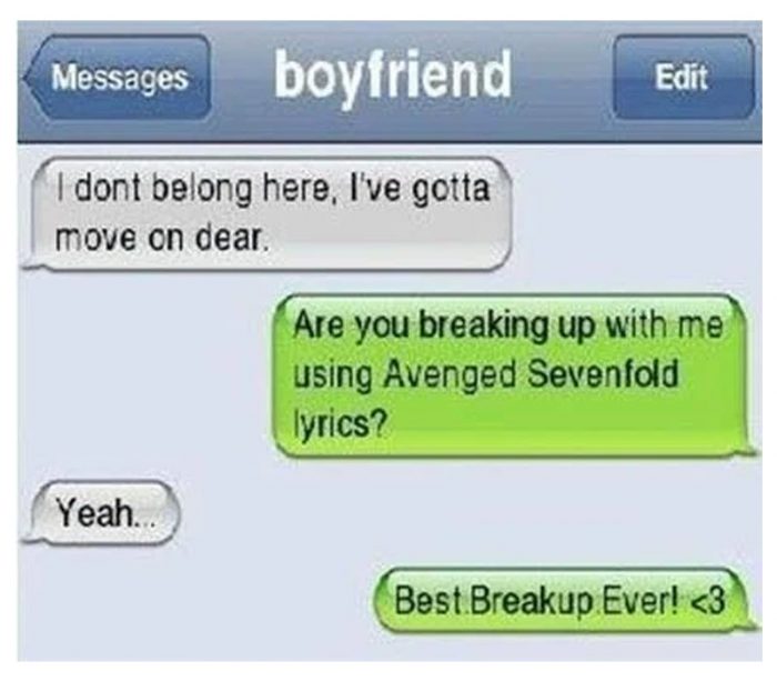 So this guy used lyrics from a band called Avenged Sevenfold and said: “I don’t belong here I gotta move on dear.” To that, the answer was “Best Breakup Ever!” Well, that’ll do.
