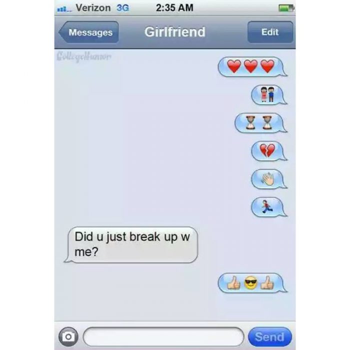 She did get the message loud and clear. So when she asked him if he’s breaking up with her he sent a smiley with two thumbs up, very mature.